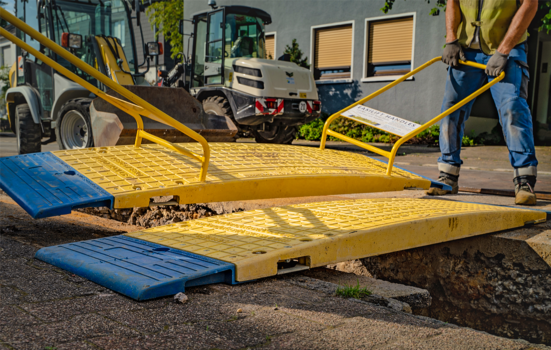Abdeckung für Fußgänger und Fahrzeuge bis zu 44t bei Arbeiten über einer 1200mm breiten Aufgrabung.