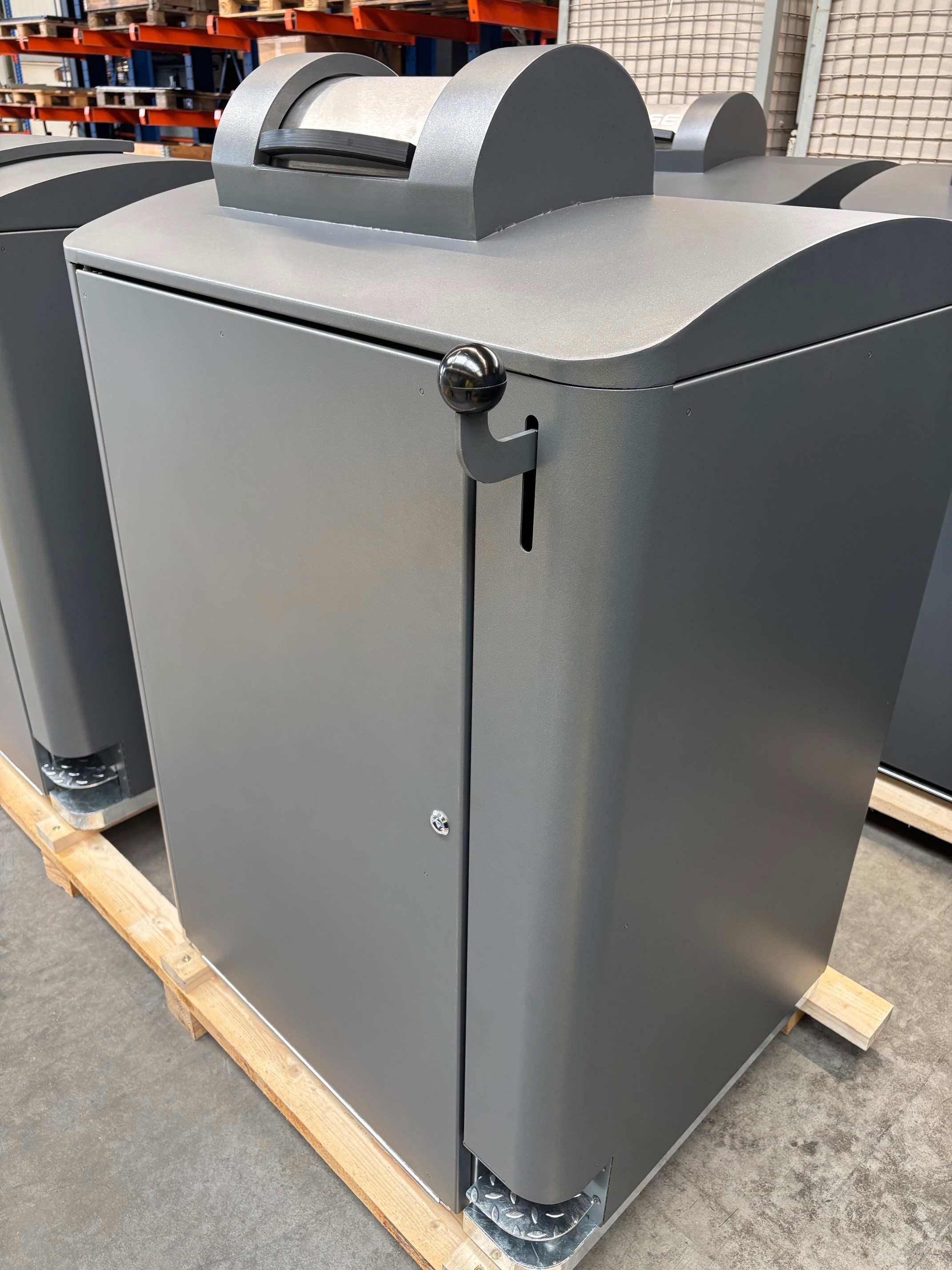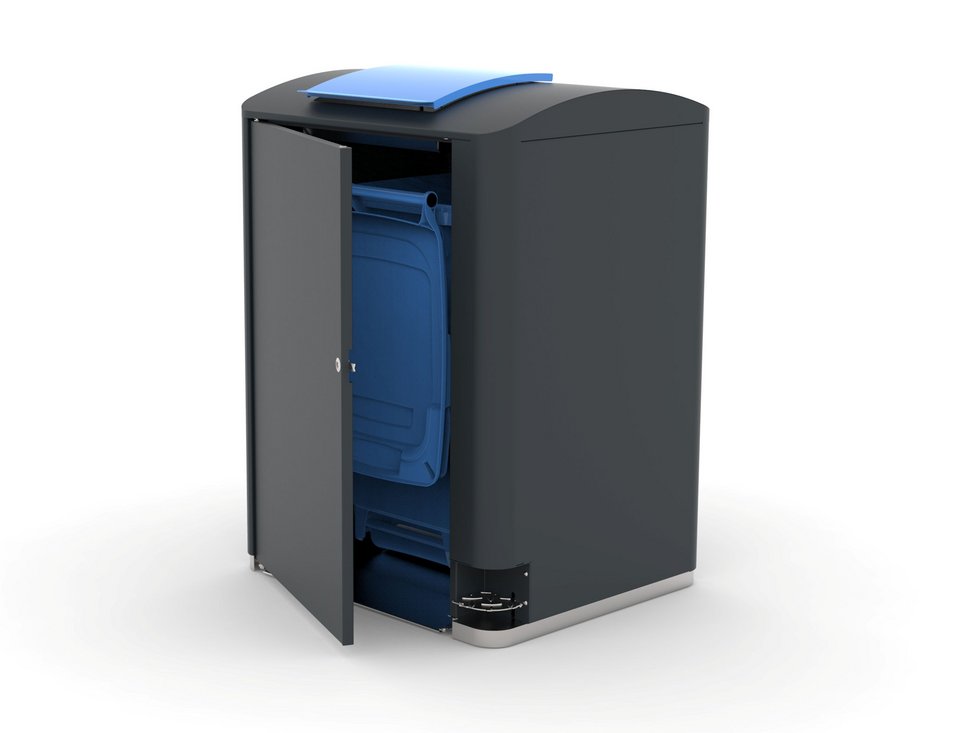 „Drive In" ist kein Abfallbehälter, sondern eine Garage für Müllgroßbehälter. Runderherum geschlossen, inkl. Boden. Mit Einfahrrampe für Müllgroßbehälter. Handelsübliche, zweirädrige 240 Liter-MGB-Kunststoffbehälter lassen sich so ansprechend in das Umfeld integrieren. Erhältlich mit Einwurfklappe und Einwurfrolle.